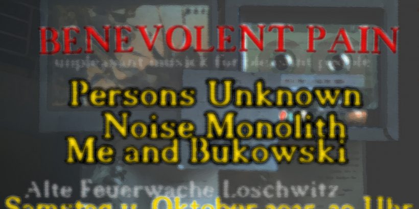 club|debil präsentiert: BENEVOLENT PAIN Persons Unknown, Noise Monolith & Me and Bukowski Industrial Power Electronics Noise – Nix für schwache Nerven 🙂 Samstag 11. Oktober 2025 Alte Feuerwache Loschwitz Leider […]